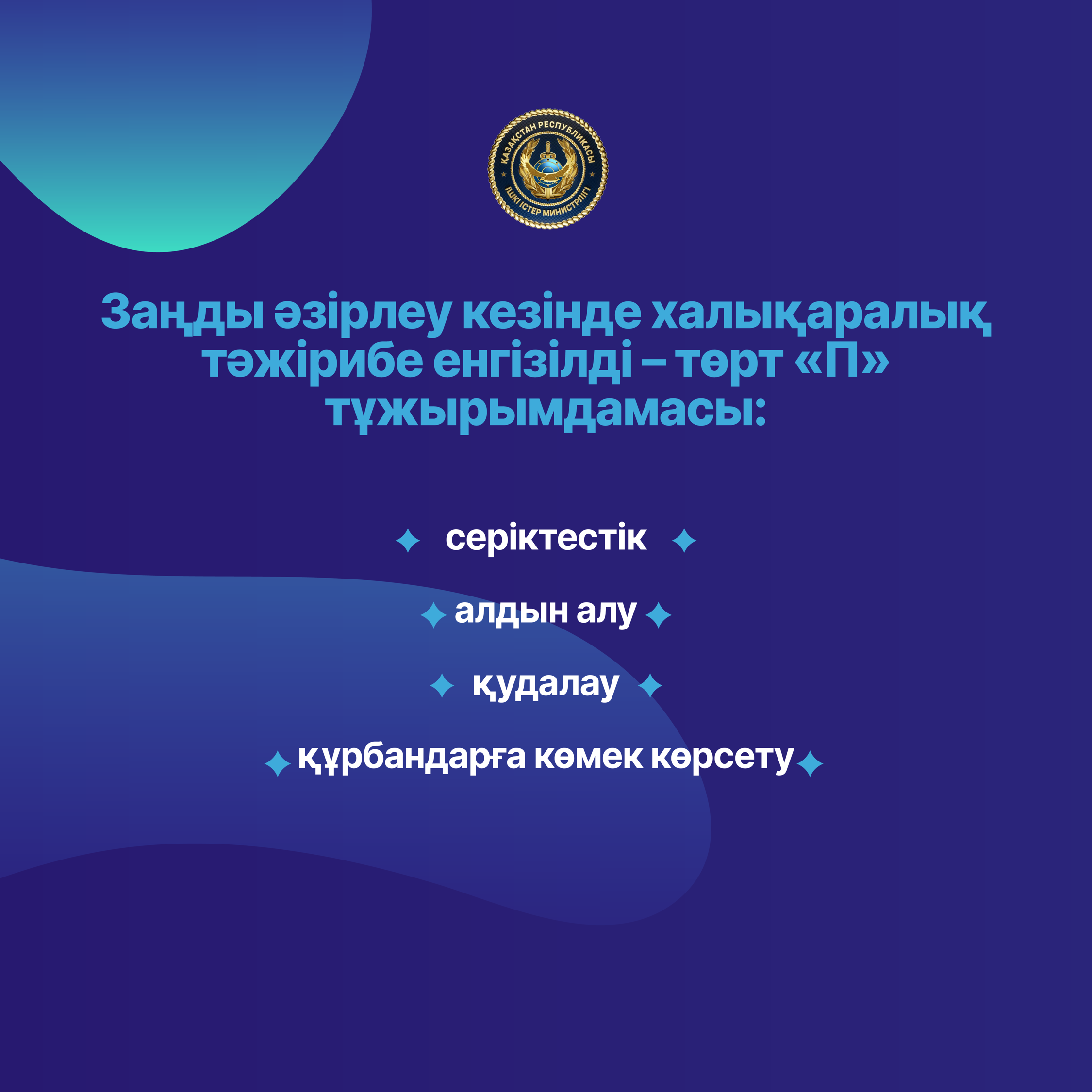 Мәселен, Заңды әзірлеу кезінде негізгі тәсілдер анықталды. Халықаралық тәжірибе енгізілді – төрт «П» тұжырымдамасы: серіктестік, ескерту, қудалау және жәбірленушілерге көмек.