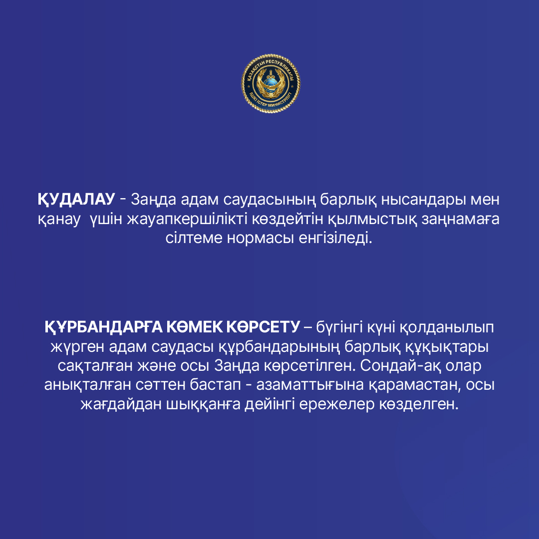Үшіншісі - қудалау. Заңда адам саудасының барлық нысандары, оның ішінде мәжбүрлі еңбек, қайыр сұрау, жыныстық қанау және органдарды алу үшін жауапкершілікті көздейтін қылмыстық заңнамаға сілтеме нормасы енгізіледі.