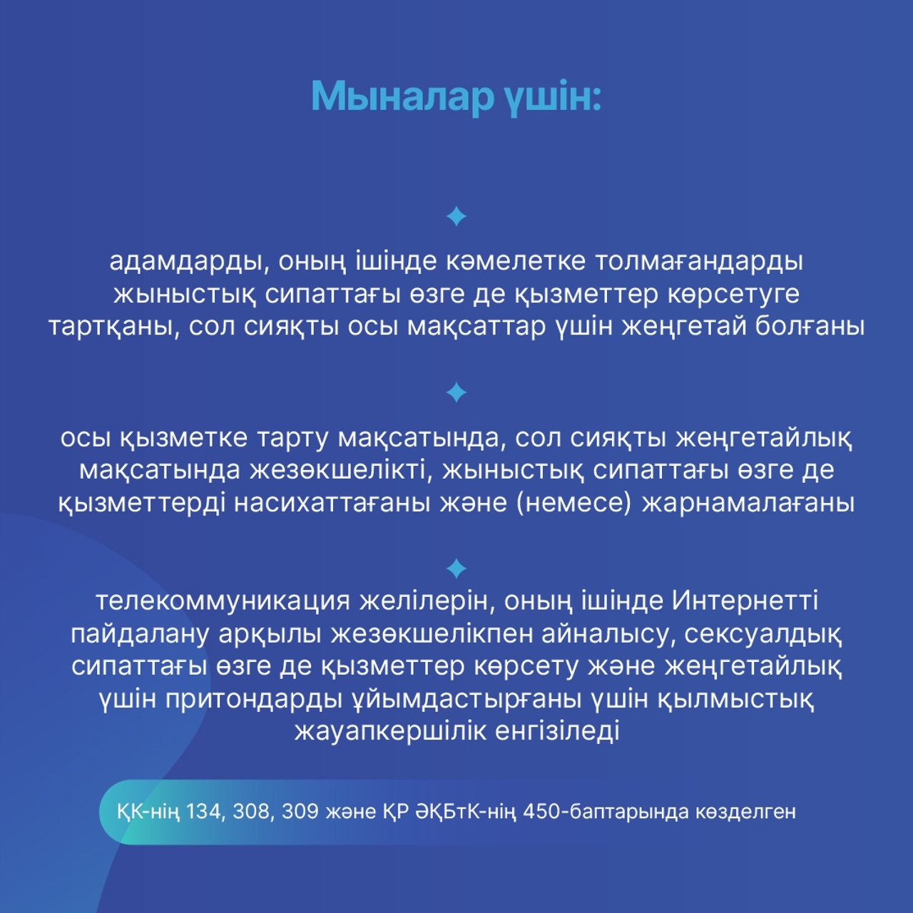 - телекоммуникация желілерін, оның ішінде Интернетті пайдалану арқылы жезөкшелікпен айналысу, сексуалдық сипаттағы өзге де қызметтер көрсету және жеңгетайлық үшін притондарды ұйымдастыру немесе ұстау.