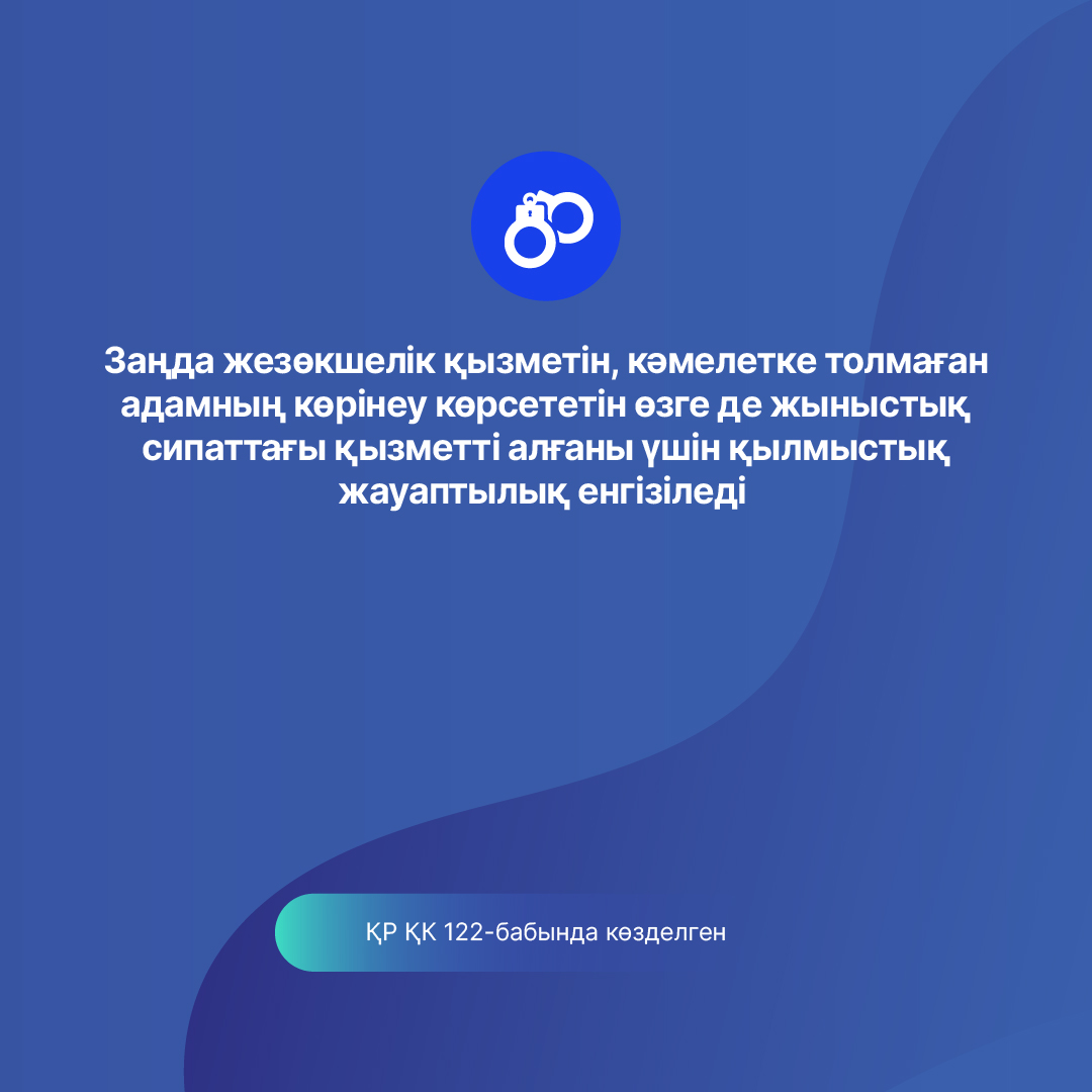 Сонымен қатар, Заңда жезөкшелік қызметін, кәмелетке толмаған адамның көрінеу көрсететін өзге де жыныстық сипаттағы қызметті алғаны үшін қылмыстық жауаптылық енгізіледі. Бұл ҚР ҚК 122-бабы бойынша жауапкершілікке тартуға мүмкіндік береді.