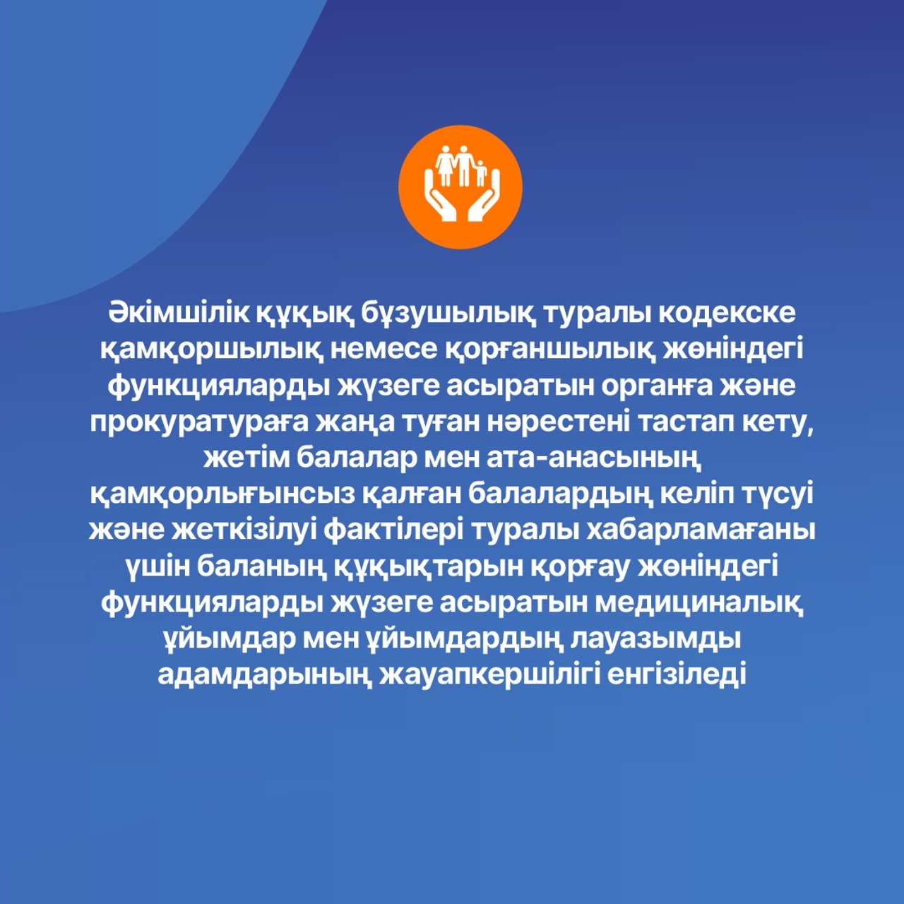 Әкімшілік құқық бұзушылық туралы кодекске қамқоршылық немесе қорғаншылық жөніндегі функцияларды жүзеге асыратын органға және прокуратураға жаңа туған нәрестені тастап кету, жетім балалар мен ата-анасының қамқорлығынсыз қалған балалардың келіп түсуі және жеткізілуі фактілері туралы хабарламағаны үшін баланың құқықтарын қорғау жөніндегі функцияларды жүзеге асыратын медициналық ұйымдар мен ұйымдар адамдарының лауазымы жауаптылық енгізіледі.