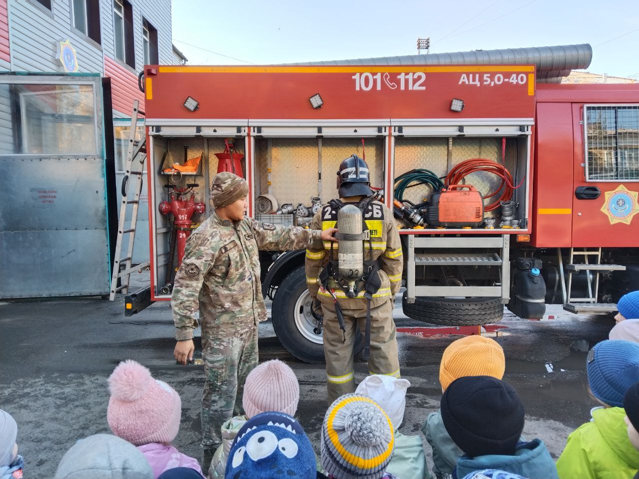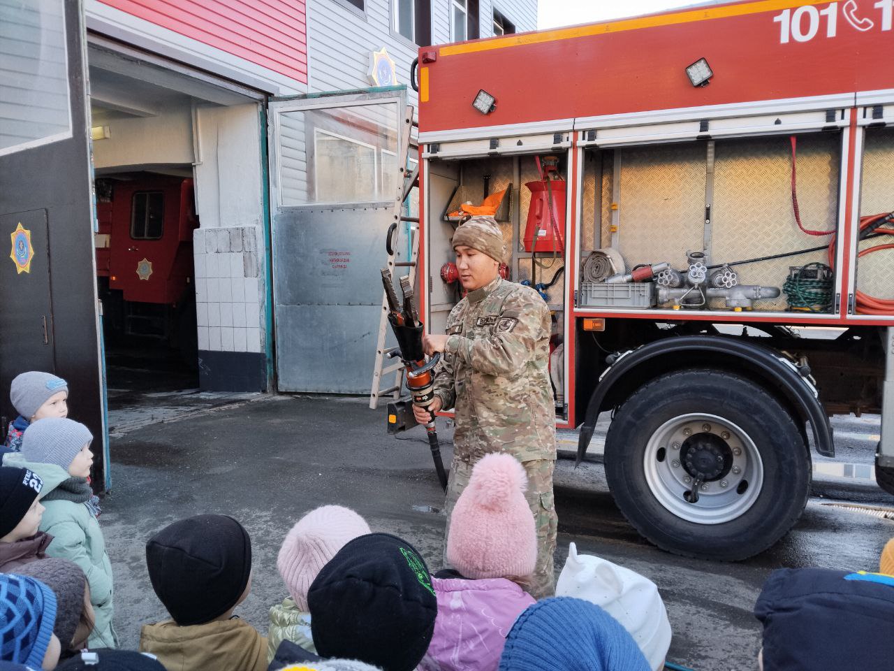 Өрт сөндіру бөліміне Экскурсия мектеп жасына дейінгі балалардың өрт сөндіруші мамандығы туралы түсініктерін кеңейту, басқалардың өмірі мен қауіпсіздігін қорғайтын адамдарға құрмет көрсетуге тәрбиелеу мақсатында өткізіледі. Экскурсия барысында балалар өрт сөндірушілердің еңбегімен, олардың арнайы техникасымен, жабдықтарымен және формасымен танысты. Оқушылар өрт дабылының қалай жұмыс істейтінін, өртті сөндіруге қандай машиналар мен құралдар көмектесетінін, өрттің алдын алу үшін қандай сақтық шараларын сақтау керектігін білді. Балалар өрт сөндірушілерге сұрақтар қоюға, өрт сөндіру машиналарын қарауға, дулыға киіп көруге, сиренаның дыбыстарын естуге мүмкіндік алады.