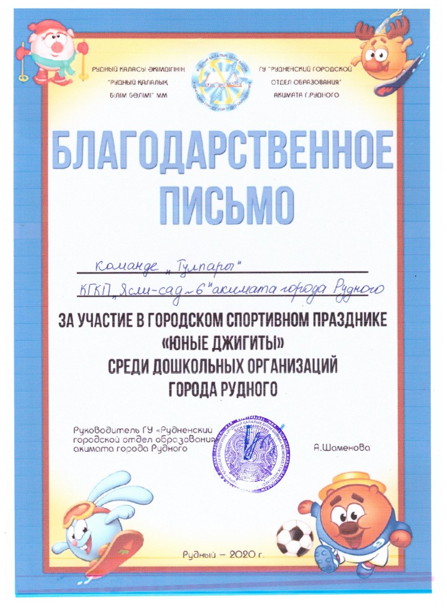 8 января 2020 г наша команда это дети из группы предшкольной подготовки КГКП «Ясли-сад №6» приняла активное участие в спортивном празднике «Юные джигиты», который ежегодно проходит среди дошкольных организаций города Рудного. Наши дошколята назвали свою команду «Тулпары». Программа спортивно-оздоровительного мероприятия «Юные джигиты» была довольно насыщенной. Участники бегали, закидывали асыки в казан, поднимали монеты на ходу, преодолевали много других заданий. Их задорный смех, солнечные улыбки и несмолкаемые реплики поддержки помогали проявить не только спортивные навыки участников, но и сплоченность, взаимовыручку и поддержку. Все этапы этого увлекательного соревнования проходили в напряженной борьбе. Болельщики и зрители следили за ходом событий и очень переживали. Вокруг царили смех, шум и веселье. Все были счастливы! А сияющие восторгом и счастьем глаза детей – лучшая награда организаторам праздника.