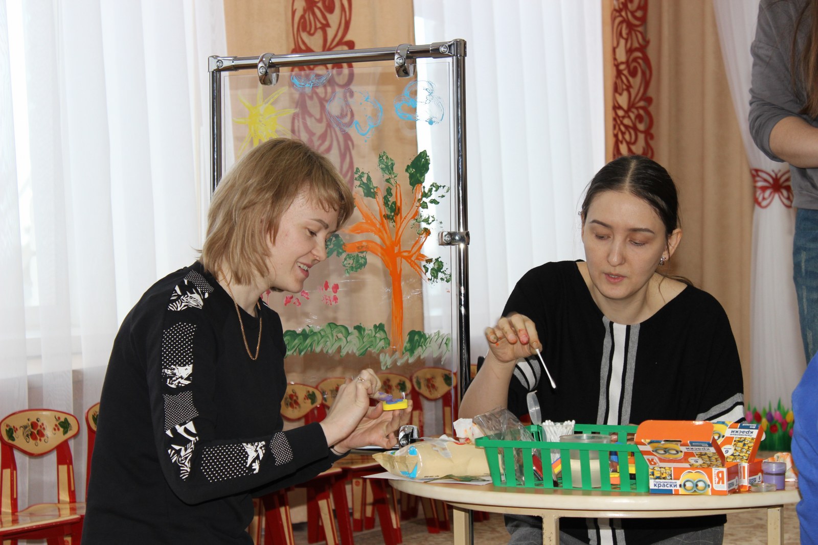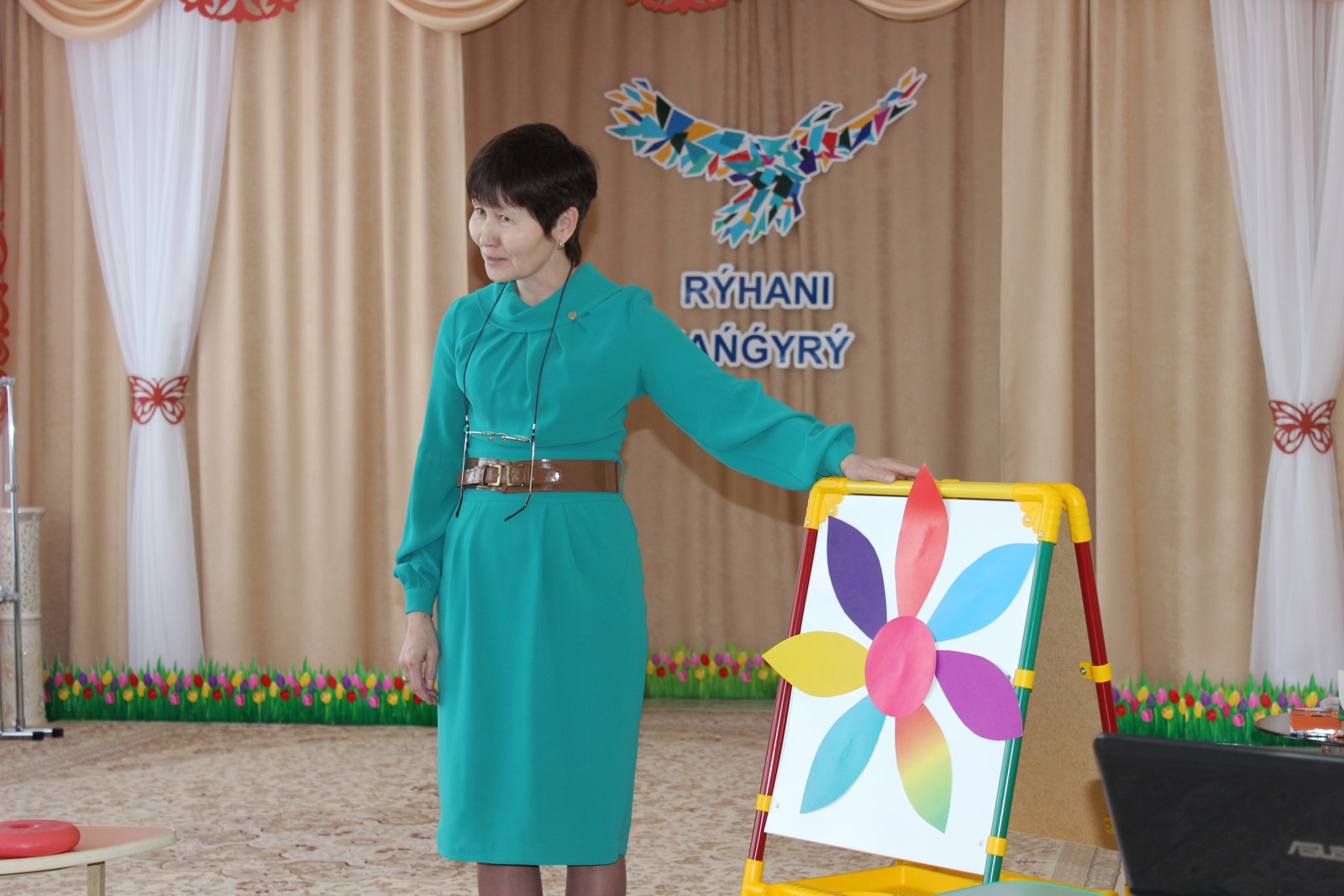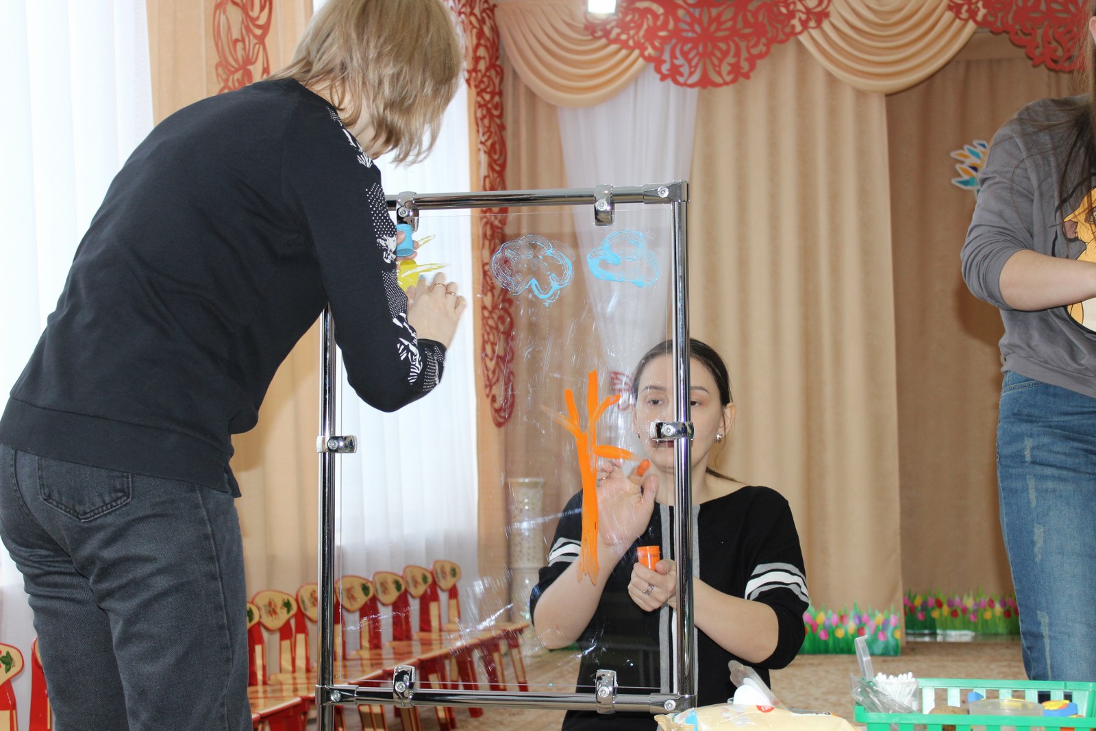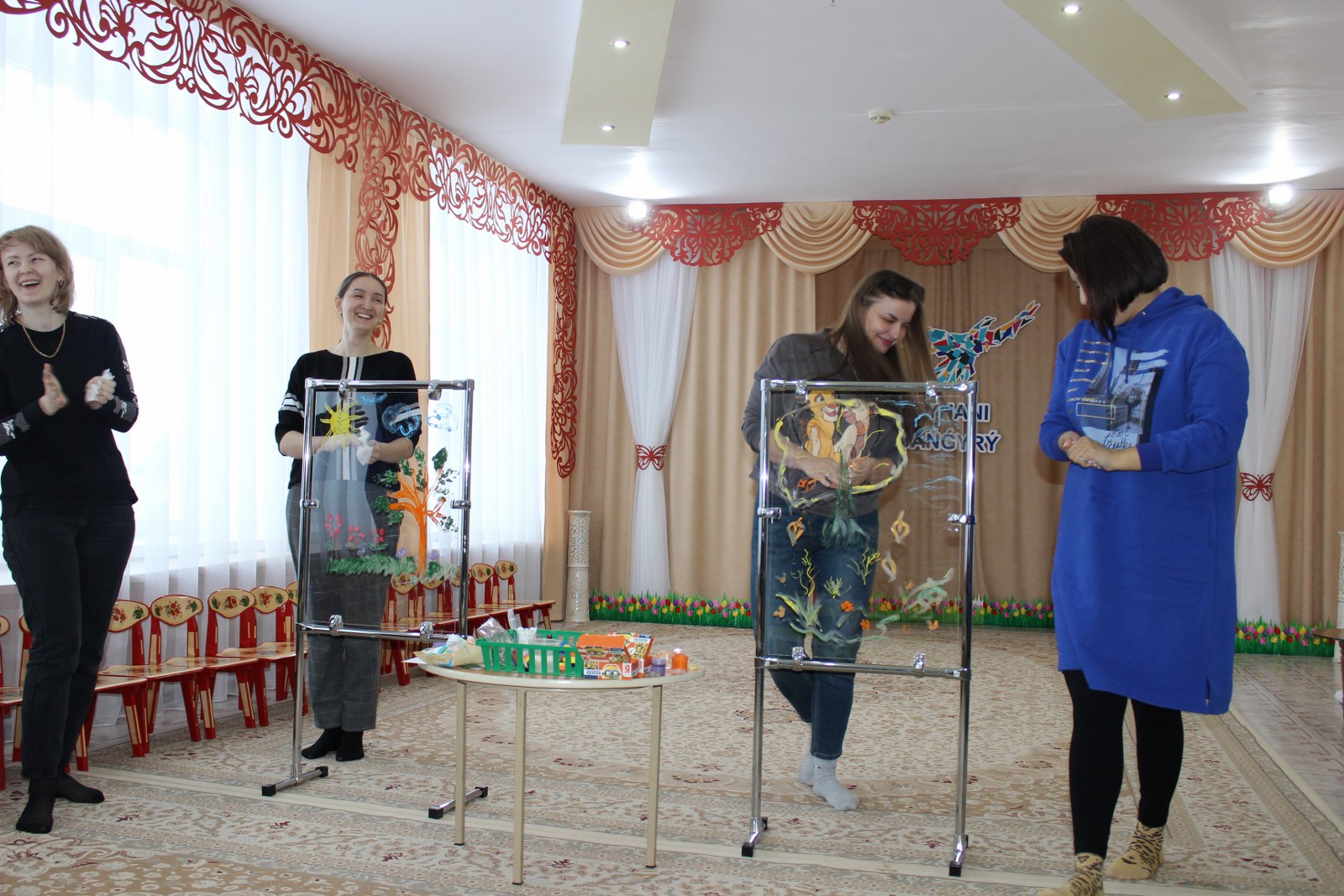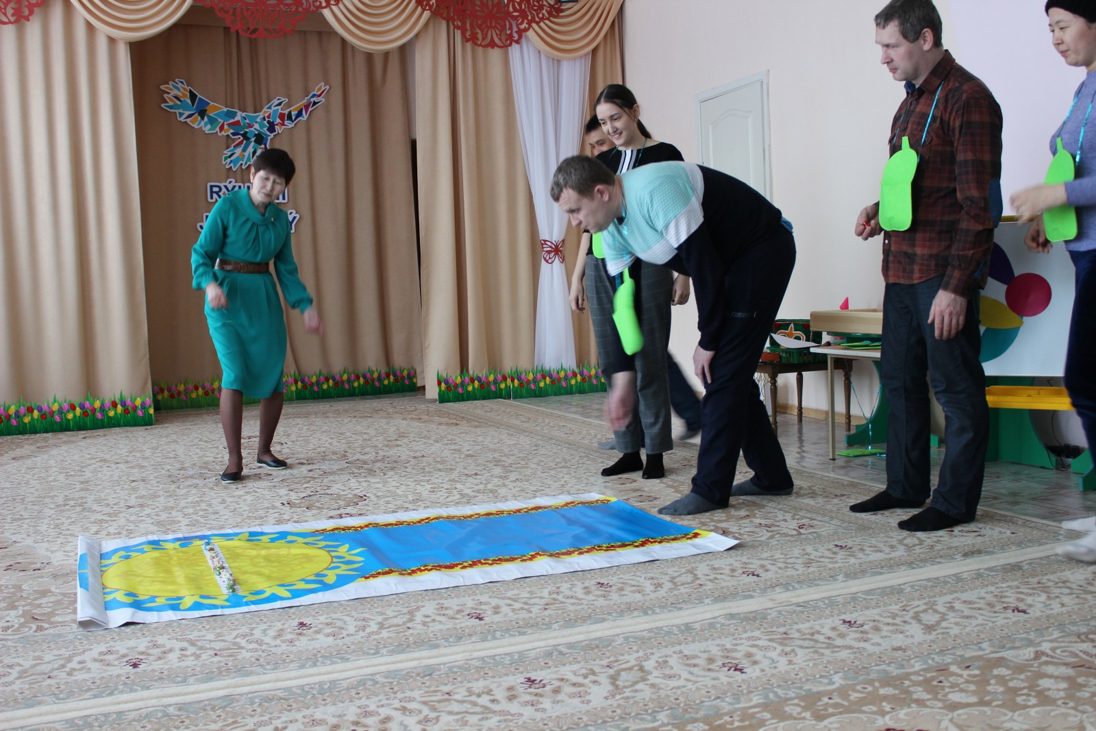 С помощью цветка - семицветика, родители и педагоги выполняли одну за одной задания. Вместе решали проблемные ситуации, родителям предложили стать участниками заданий, игр, танцев. Педагоги ДО ознакомили родителей с новыми технологиями, которые направлены на укрепление здоровья ребенка через режим дня, массаж рук, гимнастику для глаз, двигательную деятельность.