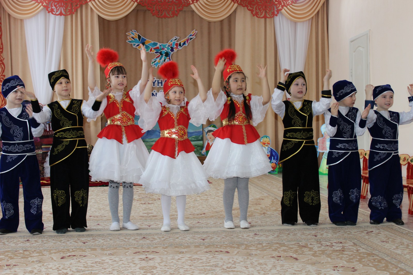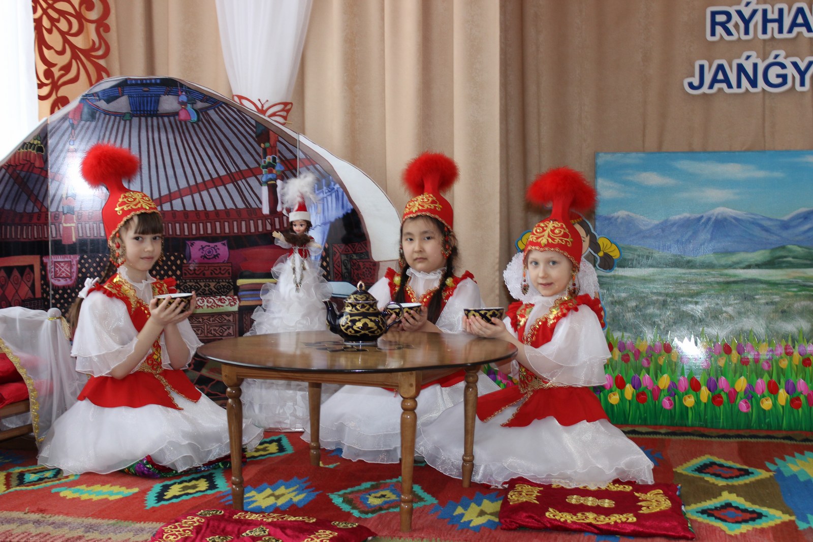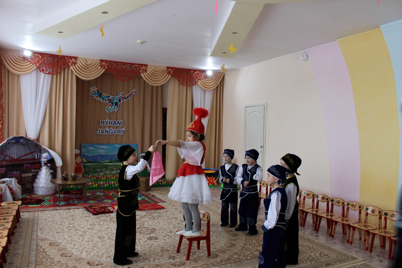 Дошколята встретились с героем казахских сказок Алдаром-Косе, который в этот день предлагал детям поиграть в игры, спеть песни и конечно же шутил. С детьми были проведены такие игры как «Построй юрту», «Байга», «Орамал тастау». Другим гостем у ребят была Ажека, которая рассказывала о празднике Наурыз, проводила и объясняла обряд «Тұсау кесу». И какой же праздник без танца «Қара жорға». Детям было предложено станцевать его с асыками, звонко стуча и выполняя движения танца дошколята с удовольствием и с успехом справились с заданием. Во время праздника в саду царила атмосфера добра, веселья и радости. Дети остались очень довольны, хотелось бы, чтобы таких дней у нас было побольше. Наурыз құтты болсын!