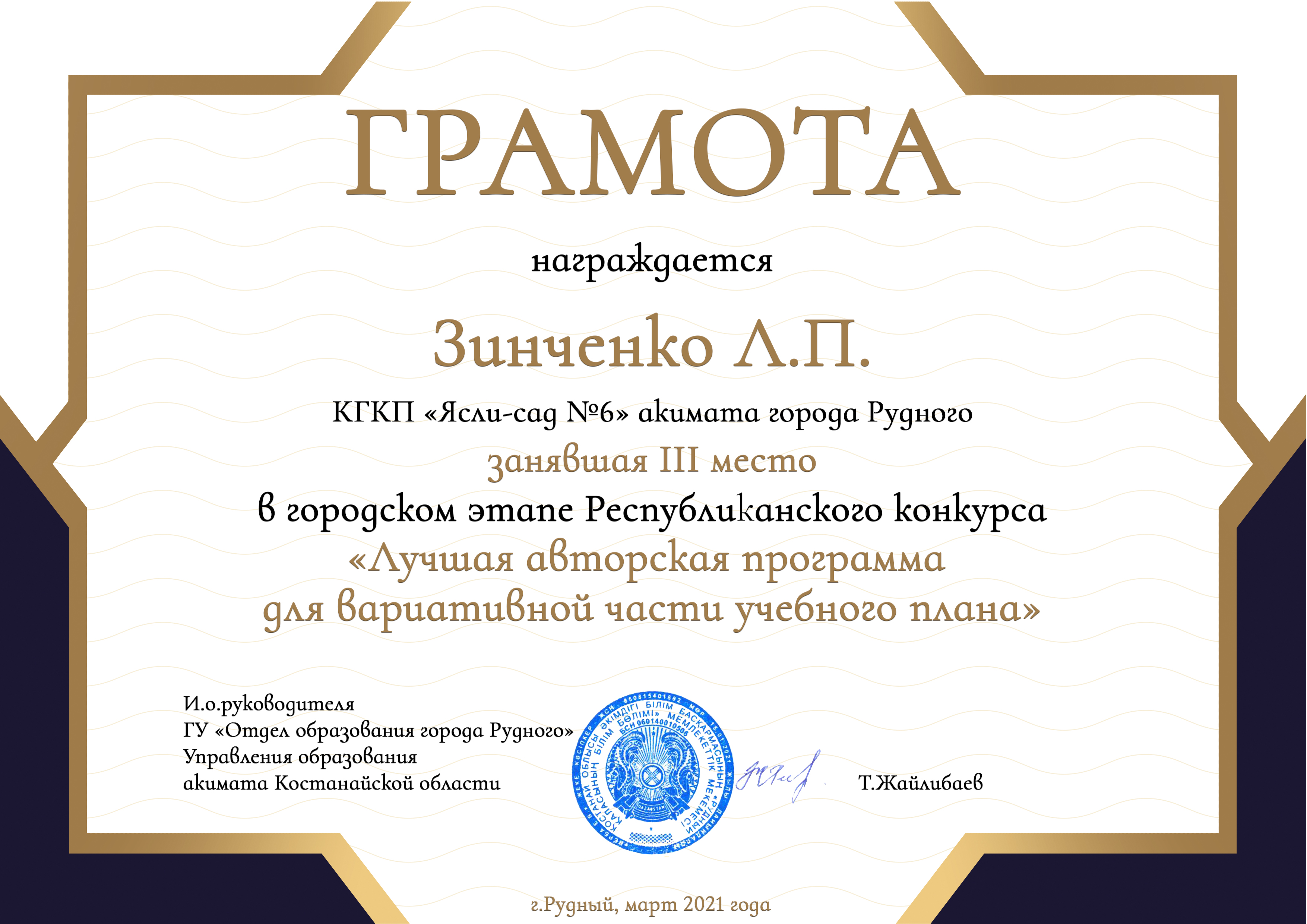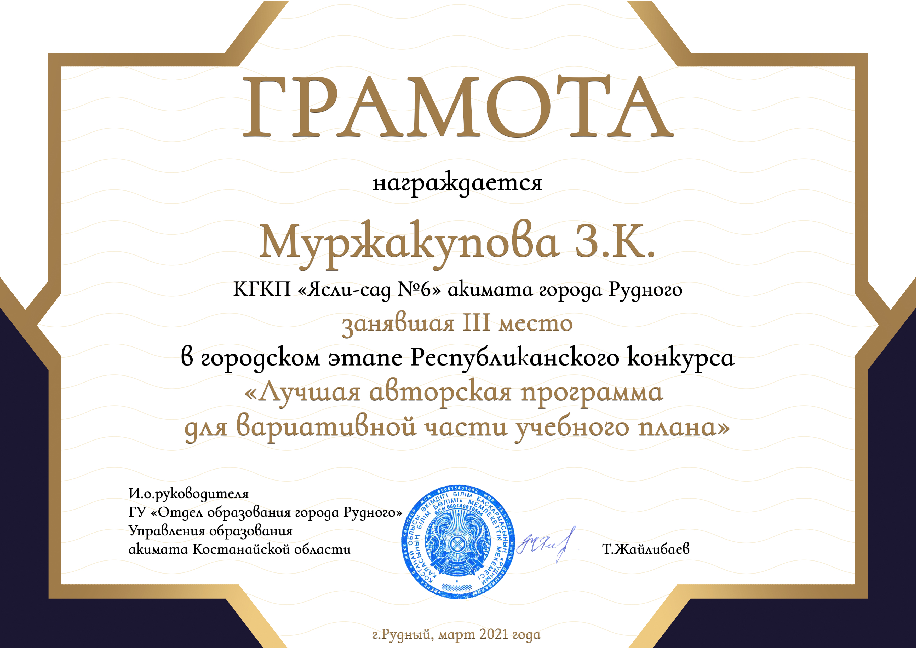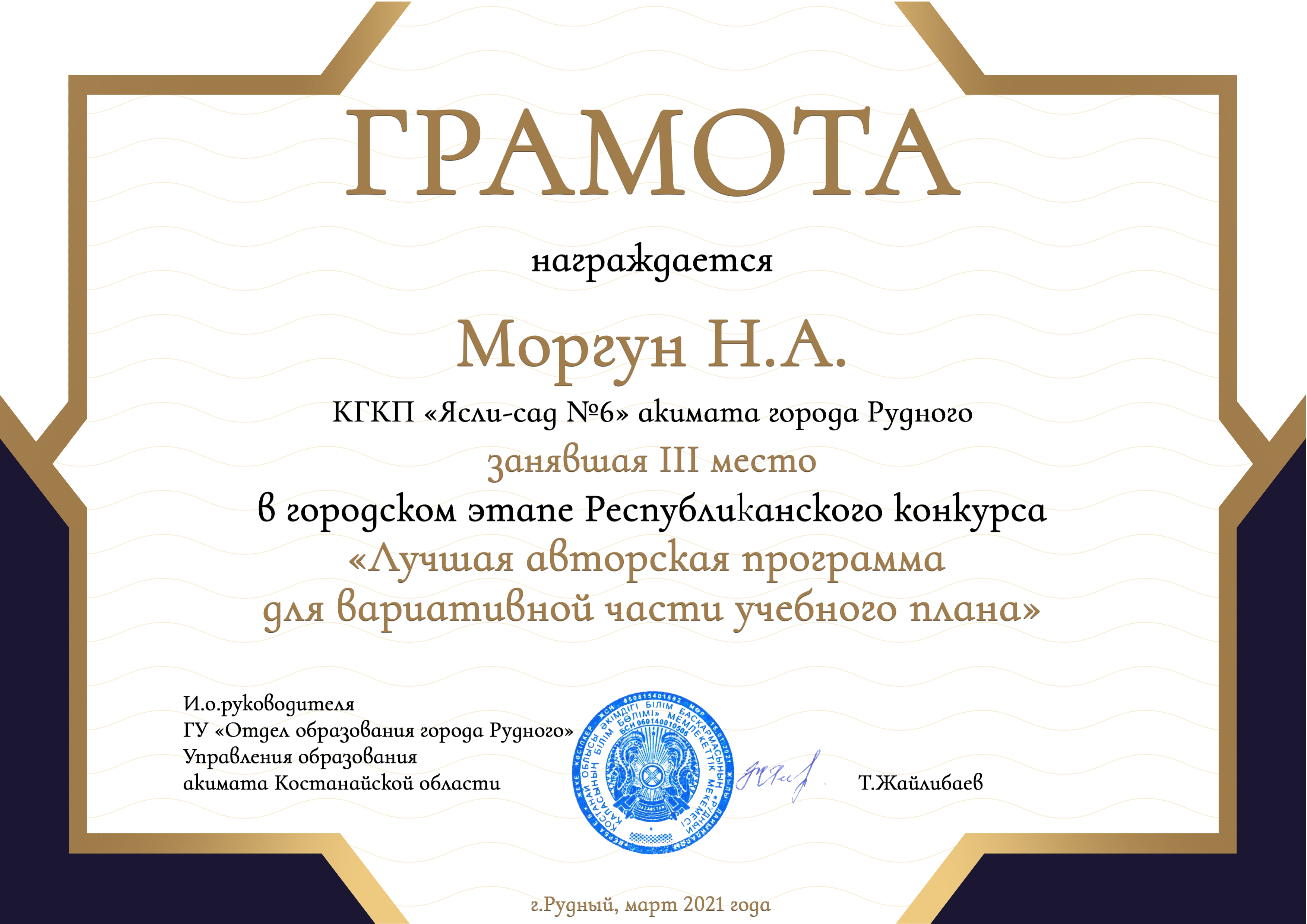 Педагоги КГКП «Ясли-сада №6» акимата города Рудного, в соответствии с планом работы Республиканского центра «Дошкольное детство» Министерства образования и науки Республики Казахстан на 2021 год, приняли участие в городском этапе Республиканского конкурса «Лучшая авторская программа для вариативной части учебного плана».