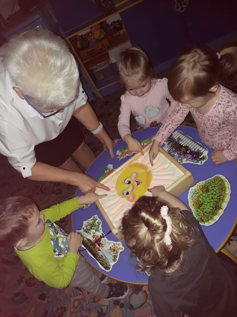 - «Солнышко лучистое…» (нетрадиционная техника рисования «пальцевая живопись» на цветовом пескографе).