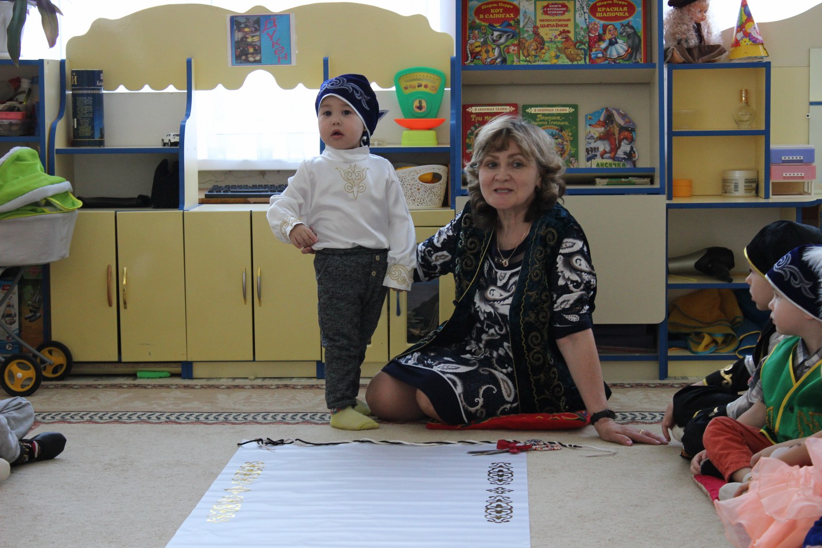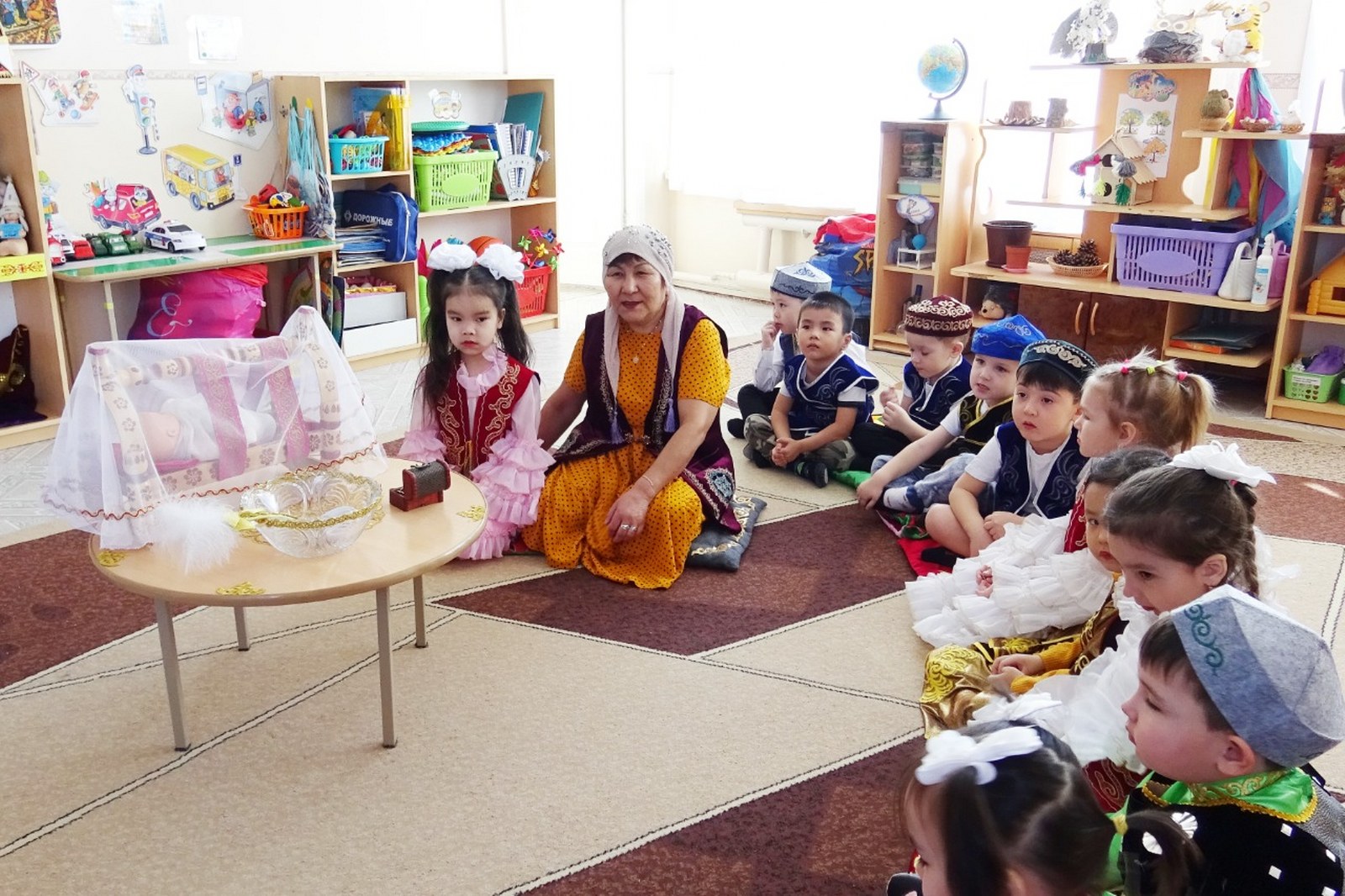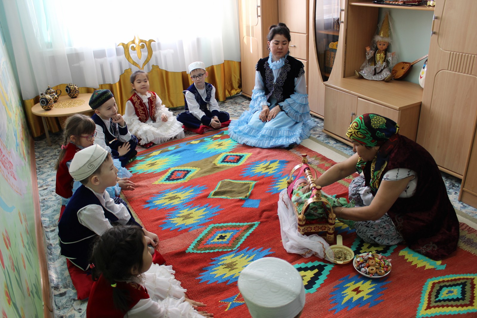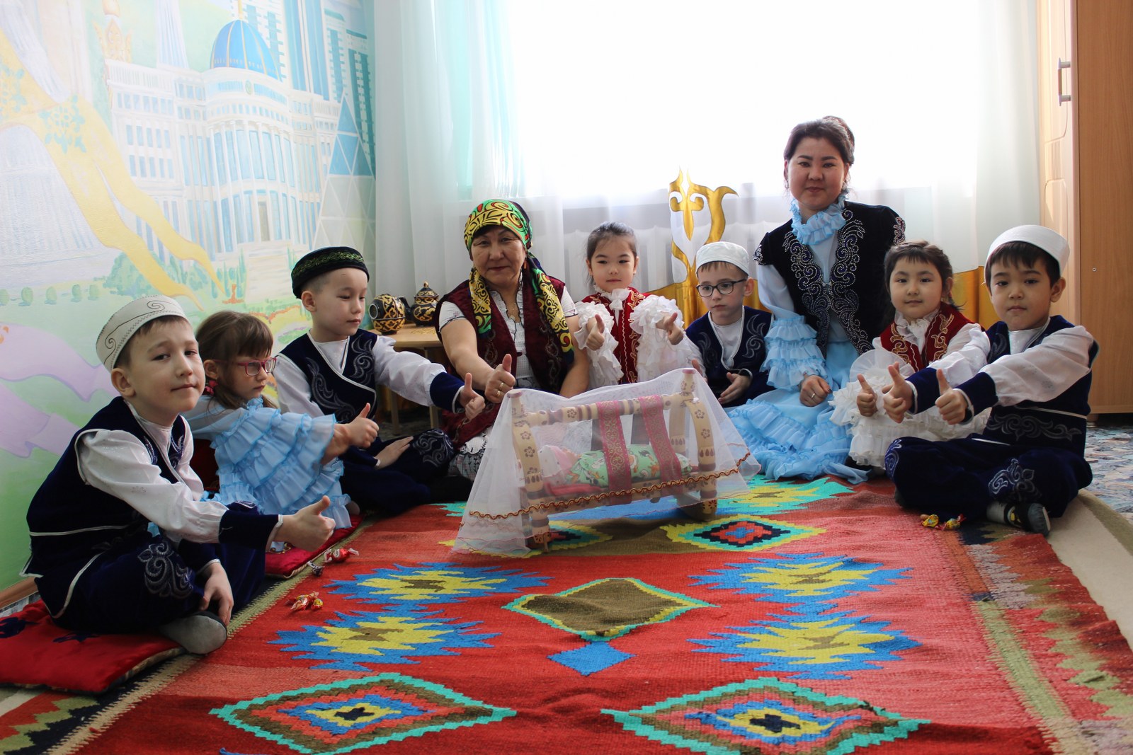 Воспитанники познакомились с обрядами: «Атқа мінгізу» (Посвящение в наездники), Ат қою ( Имя наречение), Тұсау кесу ( Разрезание пут), Қырқынан шығару (40 дней малышу), Бесікке салу (Укладывание в колыбель).
