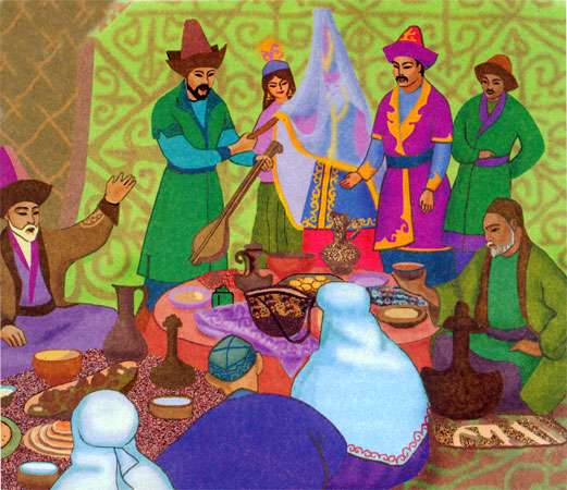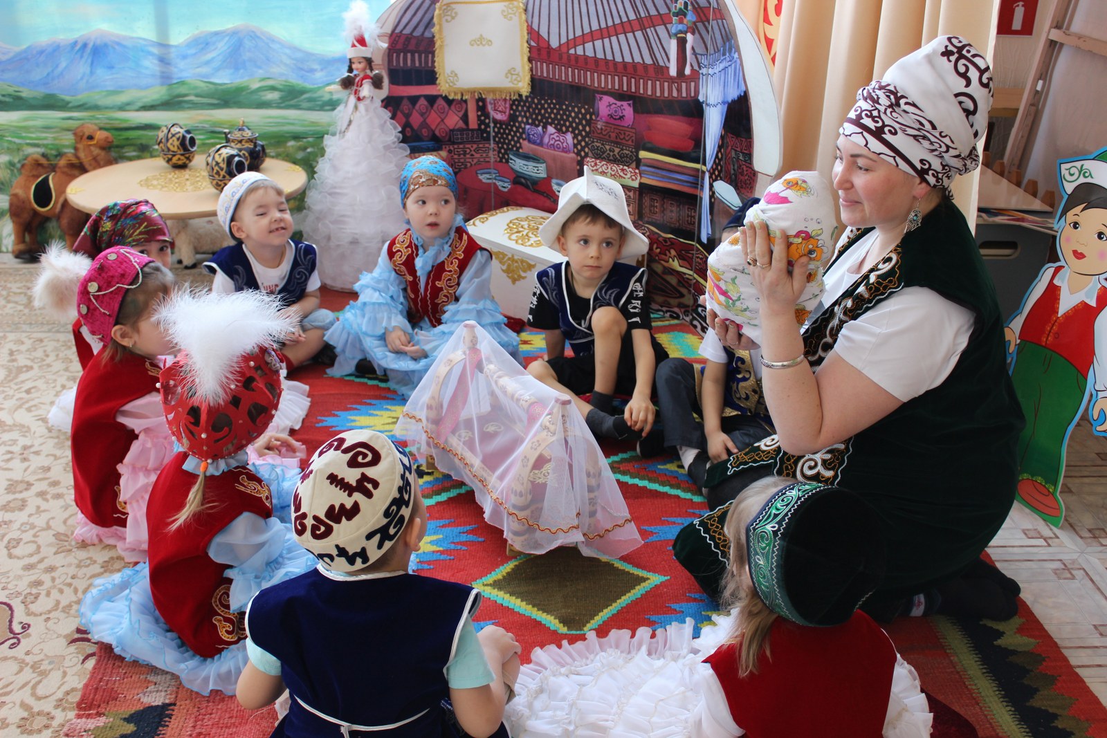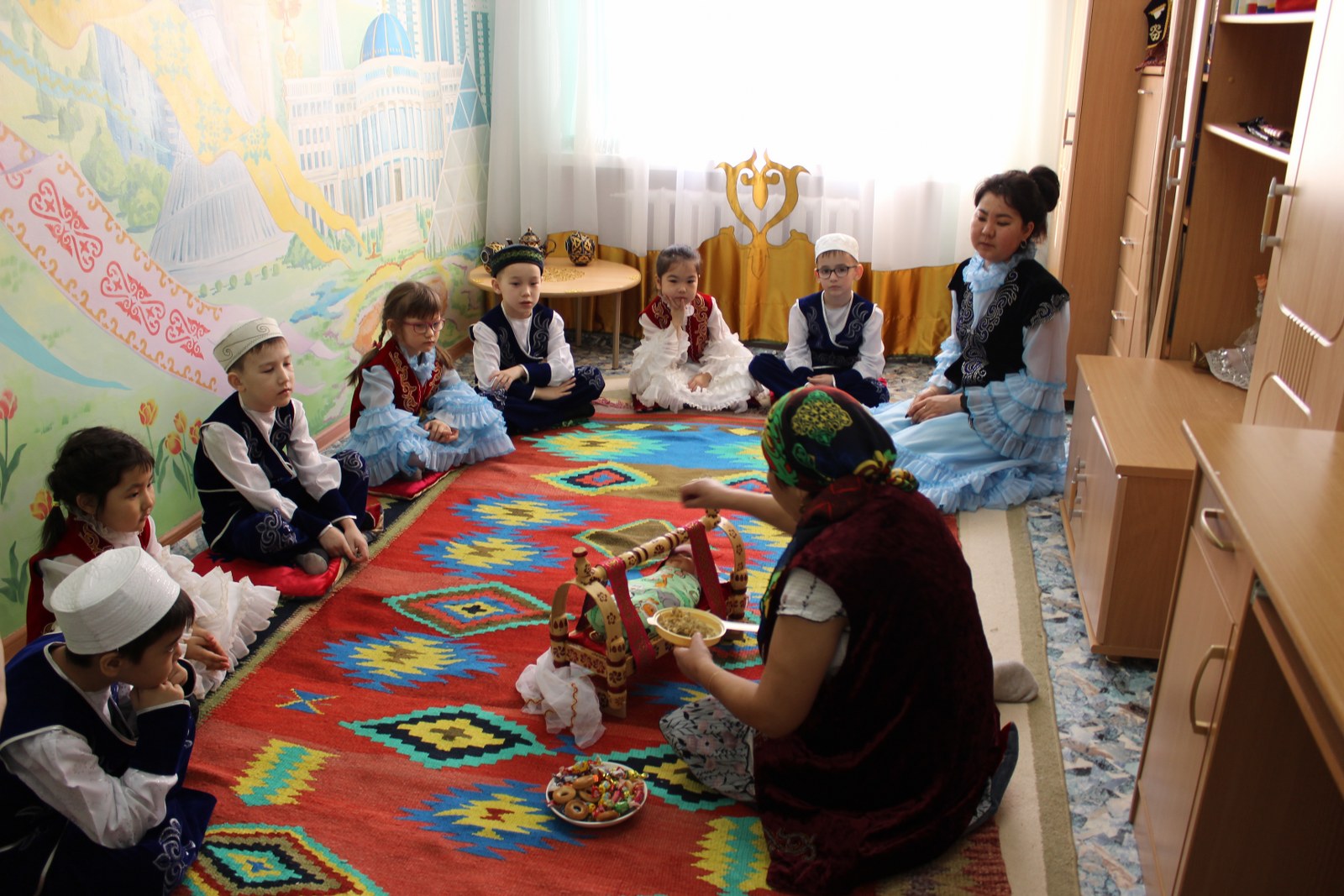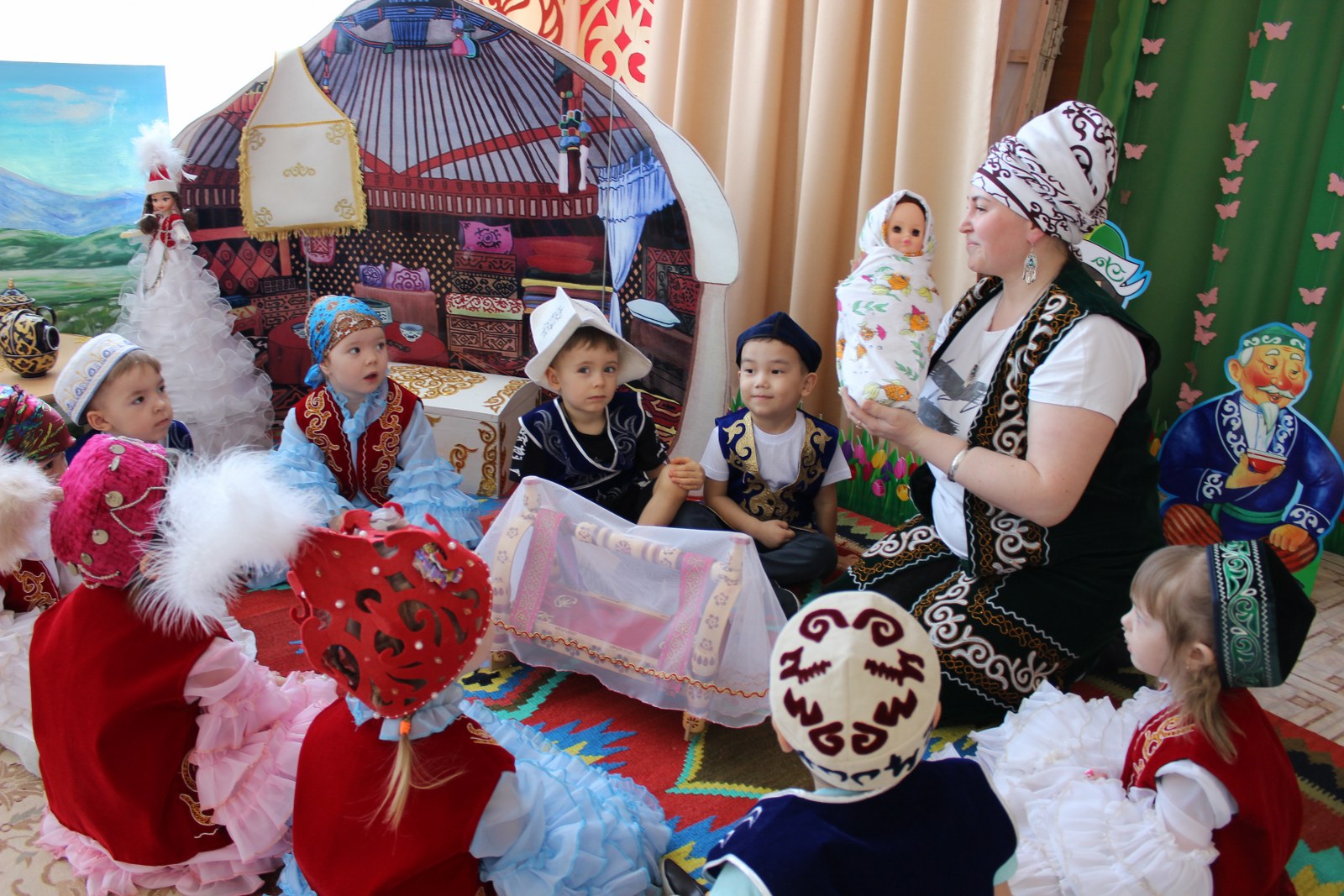Воспитанники познакомились с обрядами: «Атқа мінгізу» (Посвящение в наездники), Ат қою ( Имя наречение), Тұсау кесу ( Разрезание пут), Қырқынан шығару (40 дней малышу), Бесікке салу (Укладывание в колыбель).