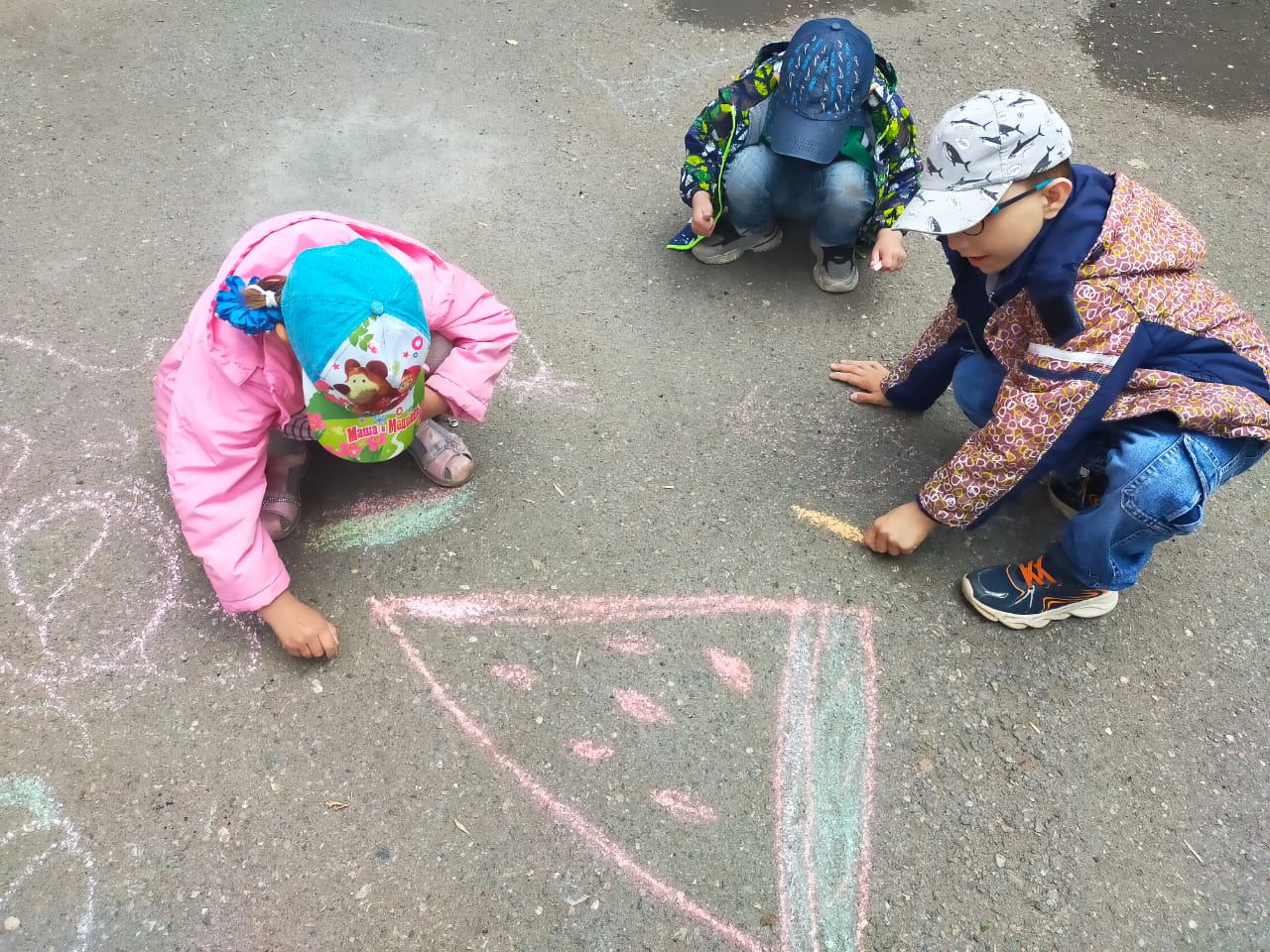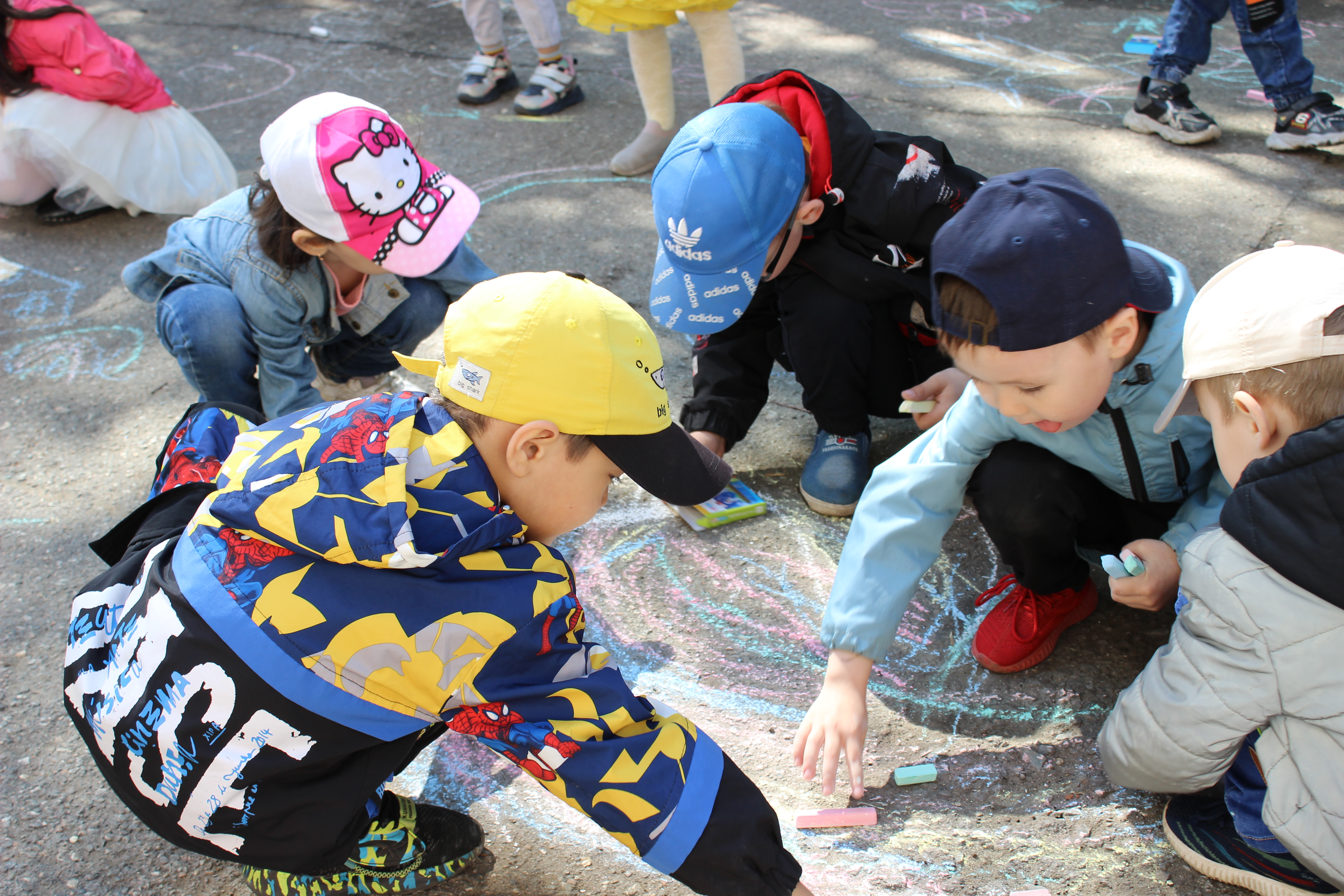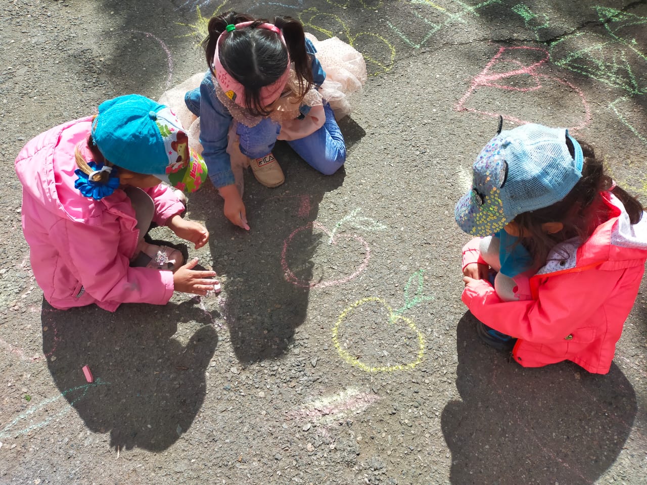 Дошколята с огромным воодушевлением рисовали на асфальтной дорожке, пускали мыльные пузыри. На рисунках были изображены цветы, солнце, небо.