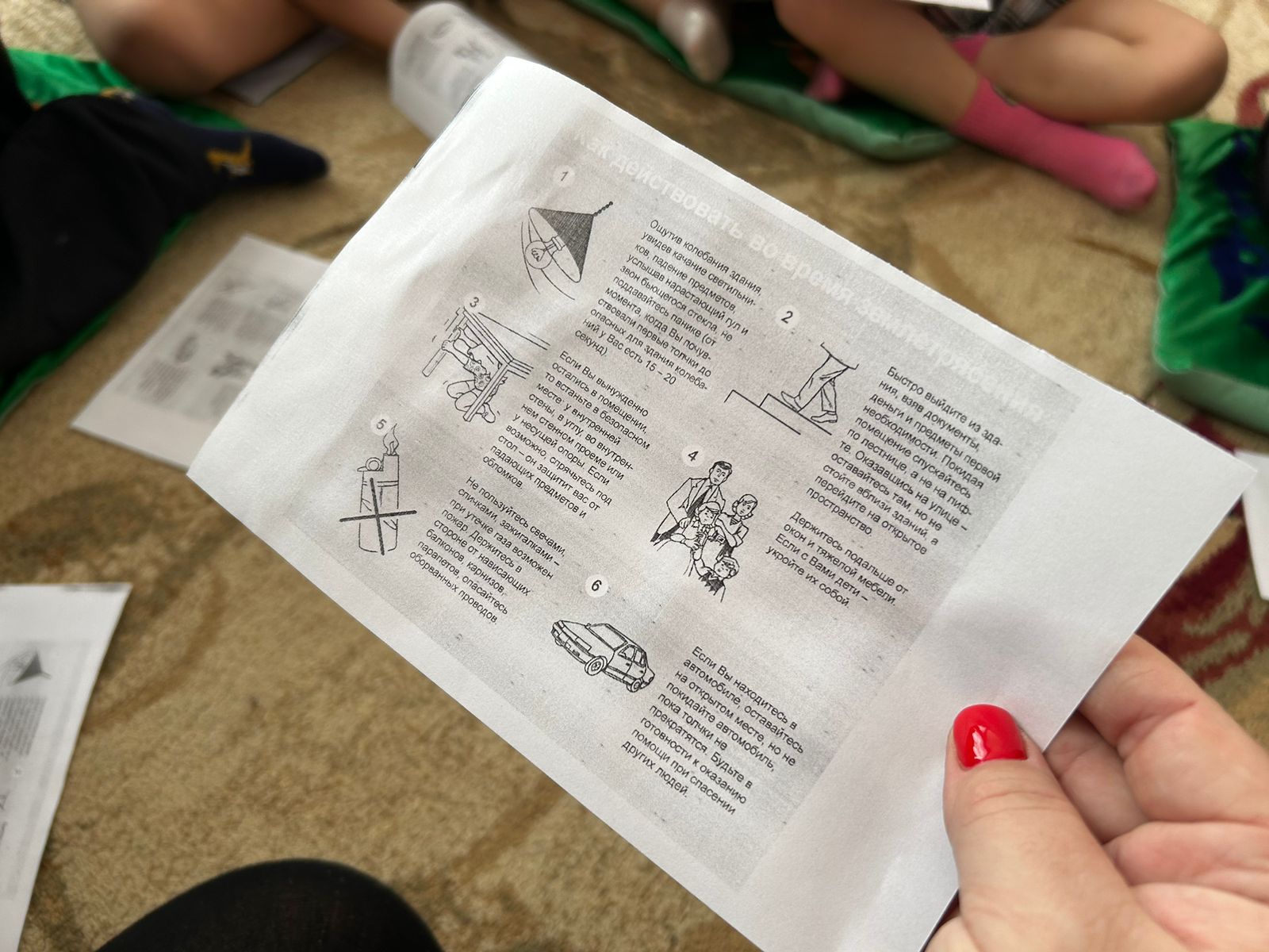 «Сегодня мы поиграли с ребятишками в землетрясение. Такой метод мы выбрали не случайно, ведь игра – основной способ обучения детей. Именно играя, ребёнок лучше запоминает основные правила. Учение получилось познавательной, веселой и незабываемой»